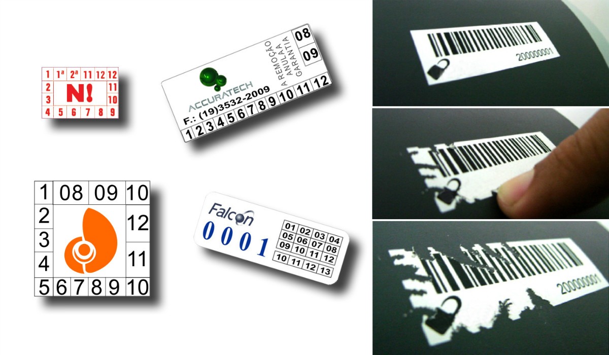 Material plástico, flexível e autoadesivo, que se destrói ao tentar ser retirado (utilizado também como lacre). Impressão: de alta resolução, resistente a solventes e produtos de limpeza em geral, abrasão leve e intempéries de tempo. Garantia de leitura assegurada. Durabilidade média de 20 anos. Cola de alta resistência com fibra de vidro. Tem resistência de exposição de até 80 graus.